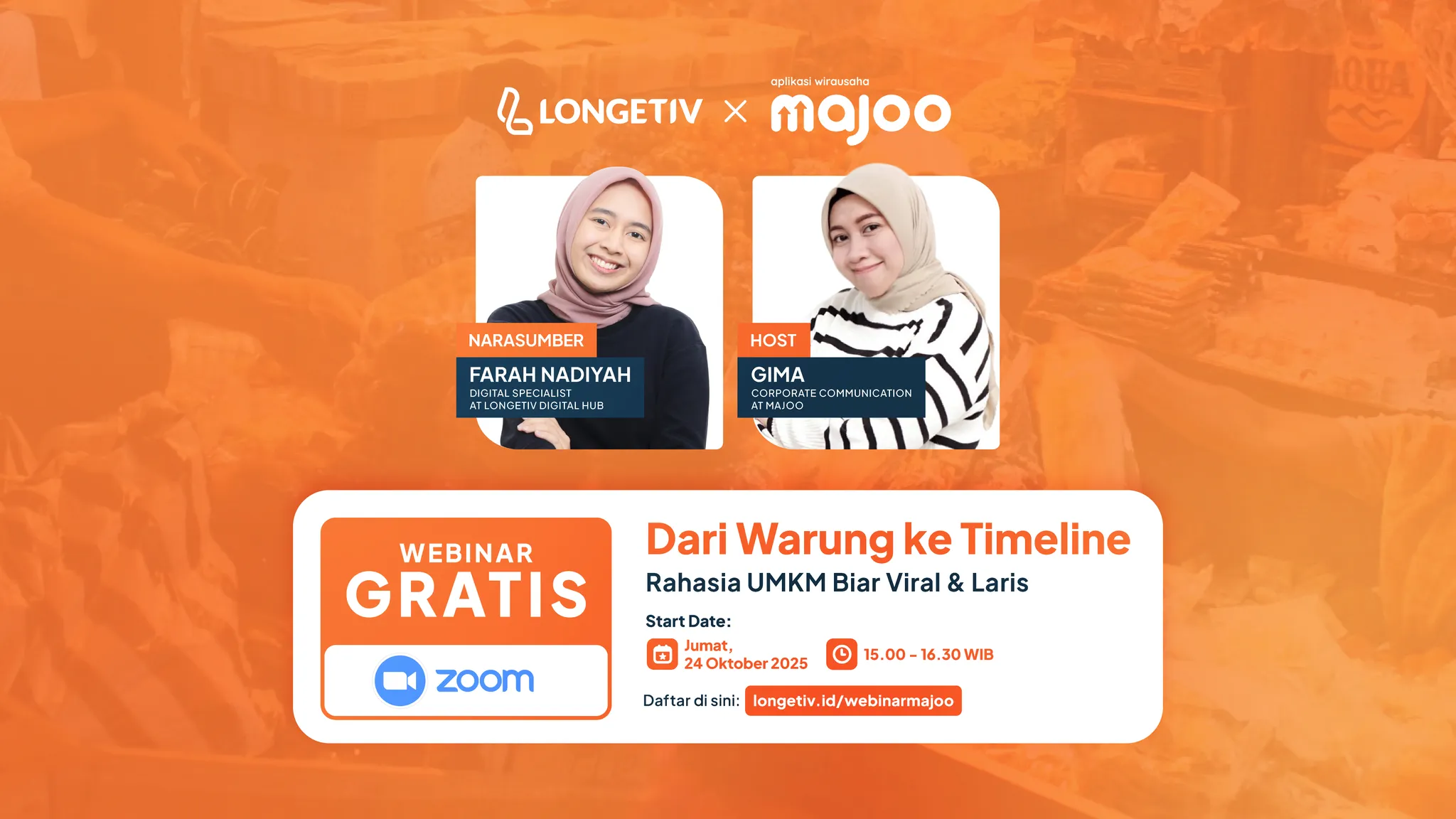 Jadi, jangan sampai kelewatan kesempatan buat belajar langsung dari ahlinya. Yuk, daftar sekarang untuk webinar nya di longetiv.id/webinarmajoo dan mulai perjalanan baru buat bikin brand UMKM kamu bersinar di timeline!